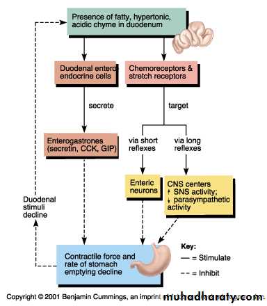CCK also inhibits stomach contraction moderately. Therefore, at the same time that this hormone causes emptying of the gallbladder, it also slows the emptying of food from the stomach to give adequate time for digestion of the fats in the upper intestinal tract. CCK also inhibits appetite to prevent overeating during meals by stimulating sensory afferent nerve fibers in the duodenum; these fibers, in turn, send signals by way of the vagus nerve to inhibit feeding centers in the brain .