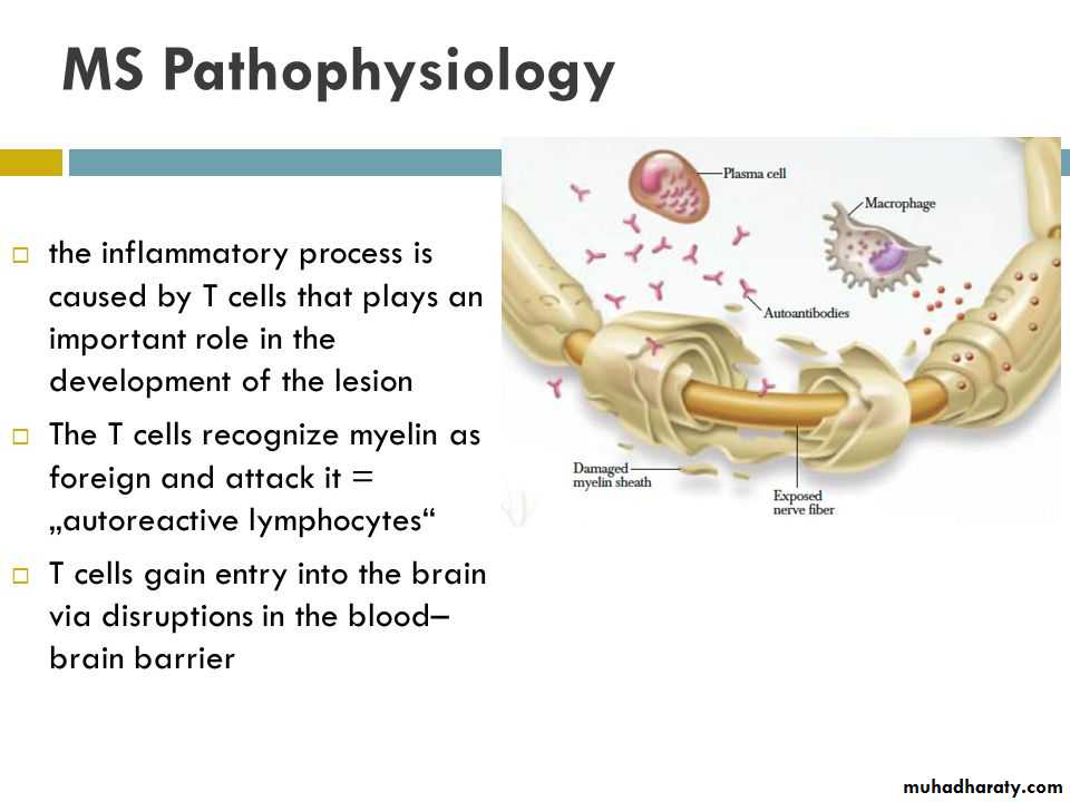 MS is an inflammatory process and Autoimmune mechanism play a major role in pathogenesis ,in which there is an abnormality due to abnormal function of macrophage,B-Cel1sandT- lymphocytes .Effect of demyelination and axonal damage.