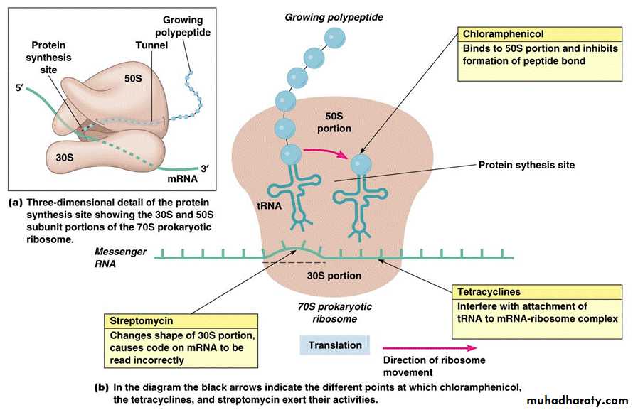 a-Tetracyclins: reversible binding to the 30s subunit of ribosome ànd inhibit binding of aminoacyl tRNA to ribosome à inhibition of protein synthesis