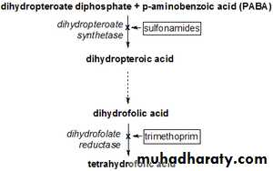 5. Antimetabolites ( sulfonamides, trimethoprim) a- sulfonamides: competes with p-aminobenzoic acid for binding to the enzyme dihydropteroate synthetase à no folic acid synthesis à no nitrogenous base synthesis b-Trimethoprim: dihydrofolate reductase inhibitor