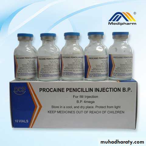 Natural penicillins: Benzylpenicillin & Phenoxymethyl penicillinThese two are known as the natural penicillins. They are the first two penicillins that were discovered and are still in use. Natural penicillins are narrow spectrum antibiotics and are only active against facultative gram-positive cocci, rods and gram-negative cocci. Severalanaerobic gram-negative rods are sensitive to penicillin, with the notable exception ofBacteroides fragilis. Benzyl penicillin is the drug of choice in streptococcal, pneumococcal, gonococcal, and eningococcal infections. It is also used in anthrax, diphtheria, gas gangrene, leptospirosis, syphilis, tetanus, yaws, and in the treatment of lyme disease in children. It is inactivated by the gastric fluids, and absorption from the gut is low; therefore it is given by injection.In addition to the use of Pen. G as sodium or potassium salts (soluble Pen. G), it is also available in two other salts that are commonly used. They are: a- Procaine penicillin: a sparingly soluble salt of benzylpenicillin. It is used in intramusculardepot preparations that provide therapeutic tissue concentrations for up to 24 hrs. It is the preferred choice for the treatment of syphilis, but neurosyphilis requires special consideration.b- Benzathine penicillin: a benzylpenicillin salt with a very low solubility, giving a prolonged action after intramuscular injection. Its duration of action is 20 days. Phenoxymethyl penicillin (Pen. V) Has a similar antibacterial spectrum as Pen. G, but it is less active. It is gastric acid stableso it is suitable for oral administration. It should not be used for serious infections because absorption can be unpredictable and plasma concentrations are variable.