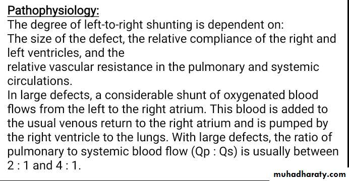 Pathophysiology: The onset and severity of clinical manifestations depends on the magnitude of Lt-to-Rt shunt which determined by: