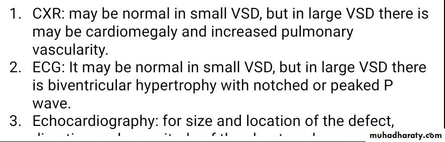 CXR: may be normal in small VSD, but in large VSD there is may be cardiomegaly and increased pulmonary vascularity.