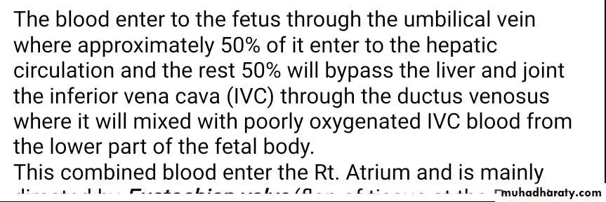 The blood enter to the fetus through the umbilical vein where approximately 50% of it enter to the hepatic circulation and the rest 50% will bypass the liver and joint the inferior vena cava (IVC) through the ductus venosus where it will mixed with poorly oxygenated IVC blood from the lower part of the fetal body.