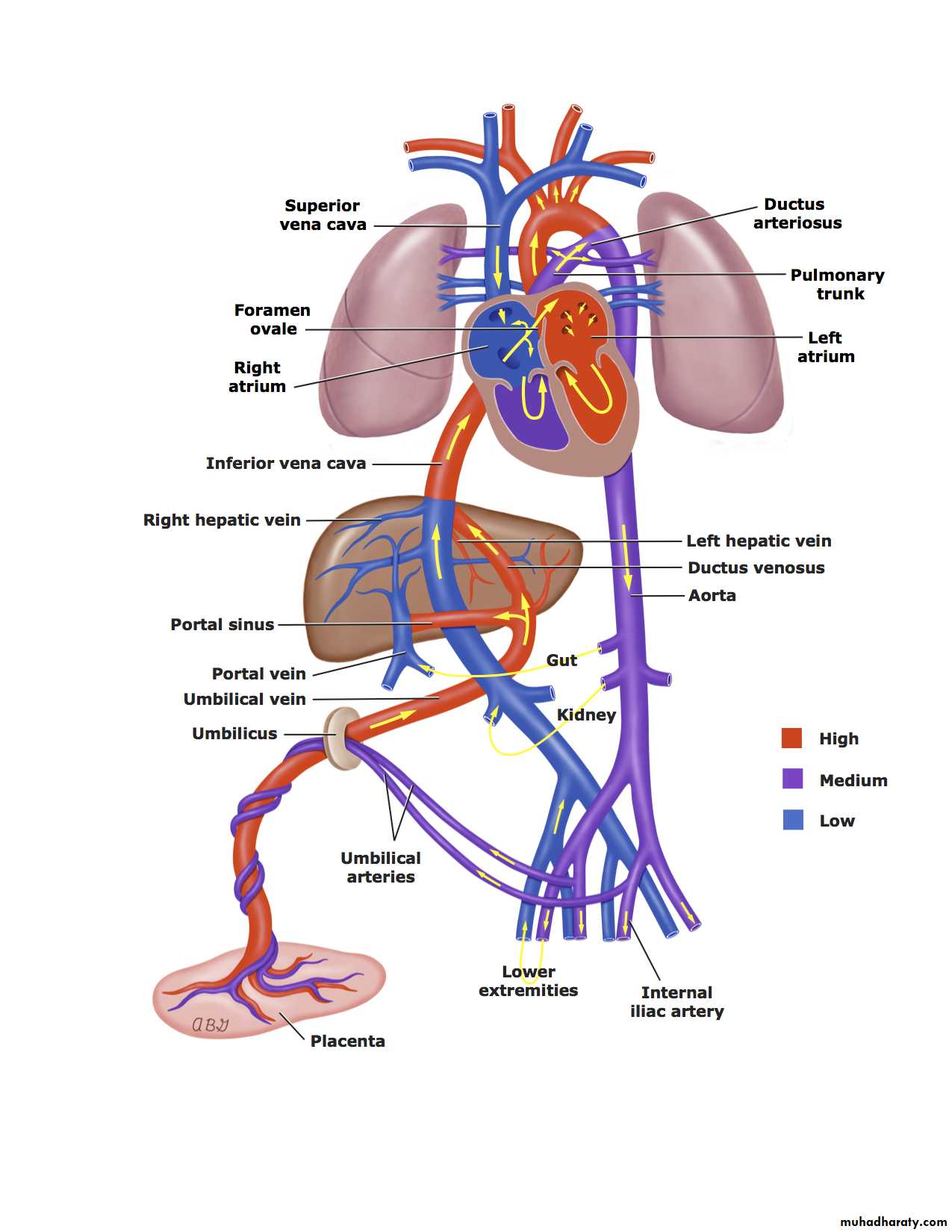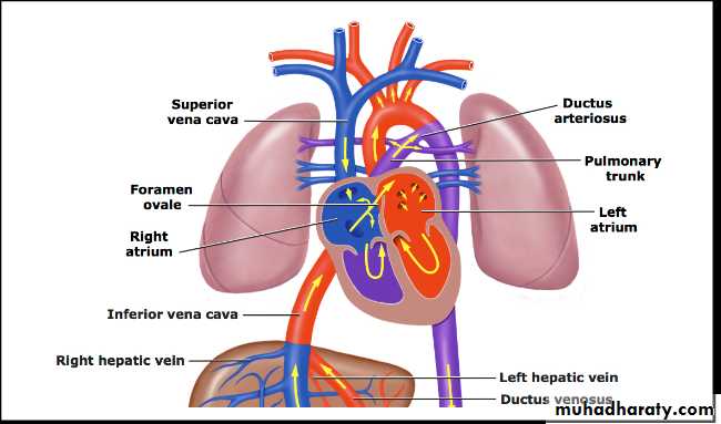 Fetal superior vena cava (SVC) blood enter the RT atrium and then mainly into the RT ventricle through the tricuspid valve then ejected into the pulmonary artery. Because the pulmonary circulation is vasoconstricted, so only 5% of the pulmonary artery blood enter the lungs and the remaining blood shifting through the ductus arteriosus to the descending aorta (Rt-to-Lt shunt) to supply the lower part of the fetal body and placenta via 2 umbilical arteries.