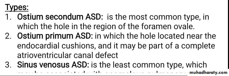 Ostium secondum ASD: is the most common type, in which the hole in the region of the foramen ovale.Ostium primum ASD: in which the hole located near the endocardial cushions, and it may be part of a complete atrioventricular canal defect