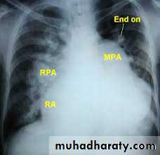 CXR: shows cardiomegaly, Rt atrial enlargement, prominent pulmonary artery and increased pulmonary