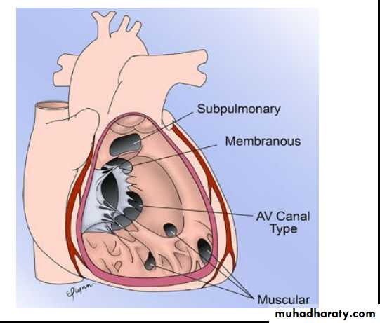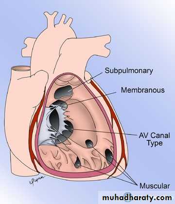 Muscular type: is located in the mid portion or apical region of the ventricular septum and it may be single or multiple (Swiss cheese septum)