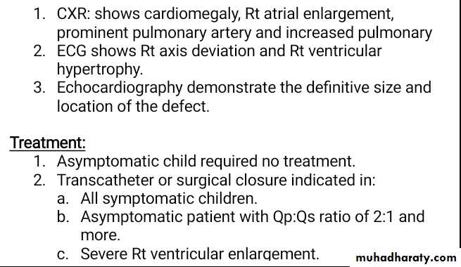 Small-moderate ASD in term infants may close spontaneously.Secondum ASD is well tolerated during childhood and complications don’t appear until the third decade or later including pulmonary HT, atrial dysrhythmias, tricuspid or mitral insufficiency and heart failure.