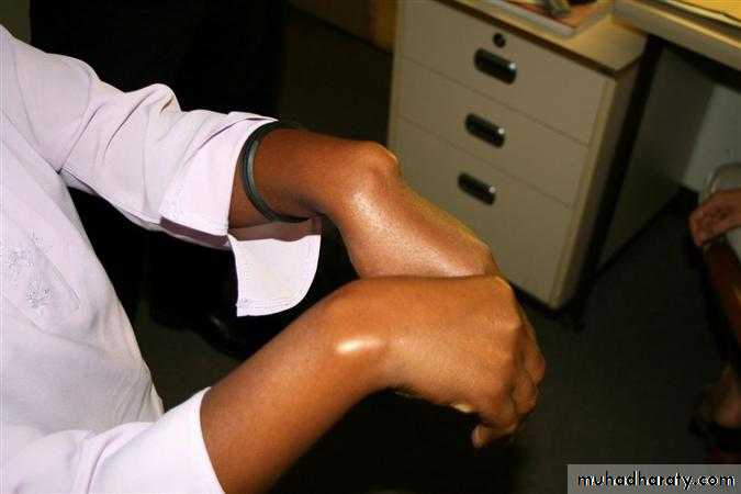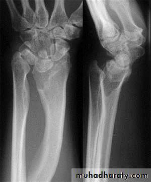 Congenital or posttraumaticLower radius curves forward & medially