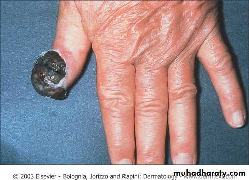 The majority of SCC occurring on the head, neck and upper extremities, present as erythematous scaly papule or noduleWhile melanoma among whites is responsible for 90% of skin cancer deaths before 50 years of age, in adults over 85 years of age, the majority of skin cancer deaths are attributable to SCC.
