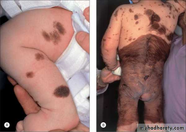 Present at birthThree types; small (less than 1.5 cm in diameter), medium (1.5-19.9 cm) and giant (more than 20 cm)