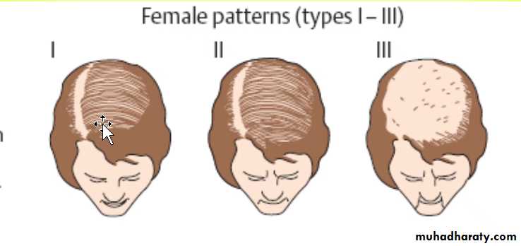 In females, androgenetic alopecia, with normal circulating androgen levels, is seen only in those who are strongly predisposed genetically.