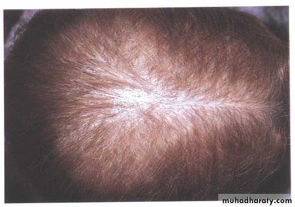 The hair loss may be much more diffuse, particularly over the crown, with preservation of hairline.