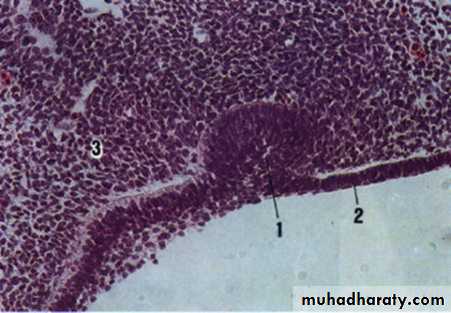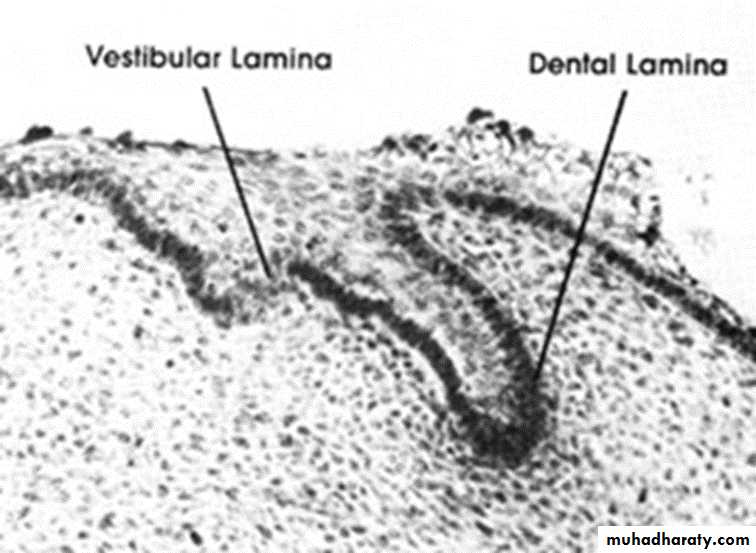 The dental lamina is a band of epithelial tissue seen in histologic sections of a developing tooth. The initiation stages of tooth development occur between the sixth and seventh week of prenatal development. The dental lamina is first evidence of tooth development and begins at three weeks after the rupture of the buccopharyngeal membrane or at the sixth week of prenatal development.Bud stage