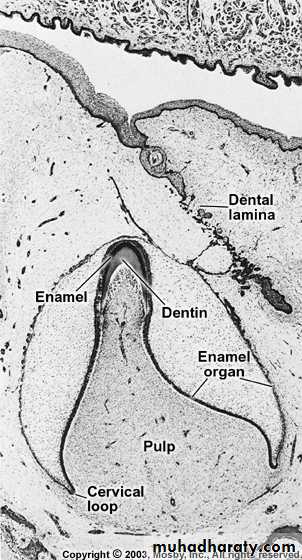 The dental lamina disintegrates, leaving the developing teeth completely separated from the epithelium of the oral cavity; the two will not join again until the final eruption of the tooth into the mouth.