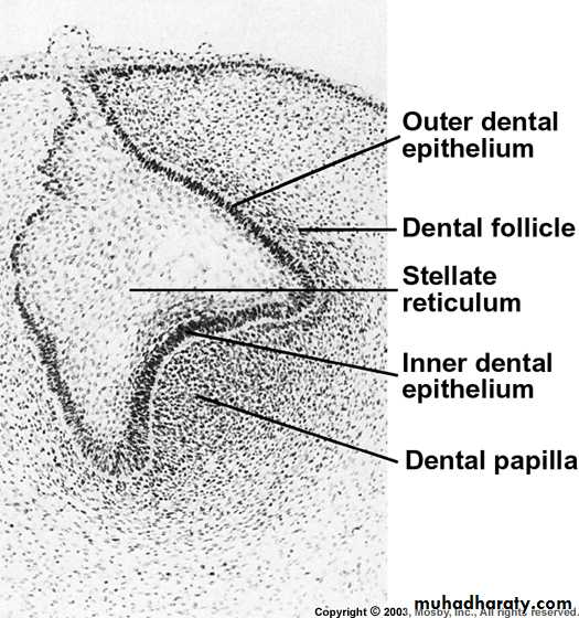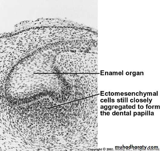 The first signs of an arrangement of cells in the tooth bud occur in the cap stage. A small group of ectomesenchymal cells stops producing extracellular substances, which results in an aggregation of these cells called the dental papilla. The cap stage occurs between the Ninth and tenth week of prenatal development.At this point, the tooth bud grows around the ectomesenchymal aggregation, taking on the appearance of a cap, and becomes the enamel (or dental) organ covering the dental papilla. A condensation of ectomesenchymal cells called the dental sac or follicle surrounds the enamel organ and limits the dental papilla.