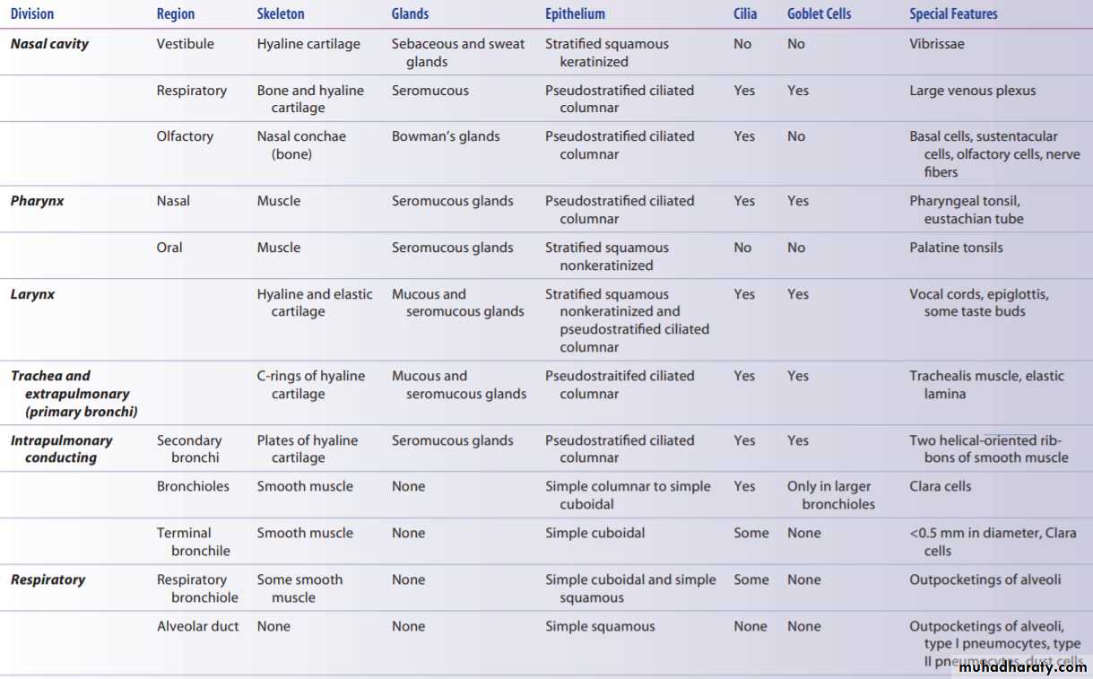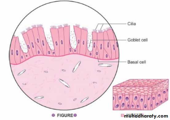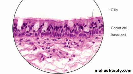Goblet cells: These cells are present from trachea to the smallest bronchi, excluding the bronchioles. In the smokers, the goblet cells increase in number and extend into the bronchioles as well.???? Clinical consedration!!