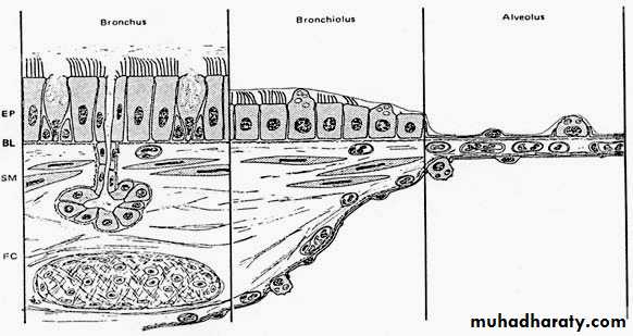 Change of airway wall structure at three principal levels in the lung. The epithelium (EP) gradually reduces from pseudostratified to cuboidal and then to squamous, but retains its organization as a mosaic of lining and secretory cells. The smooth-muscle layer (SM) disappears in the alveoli.