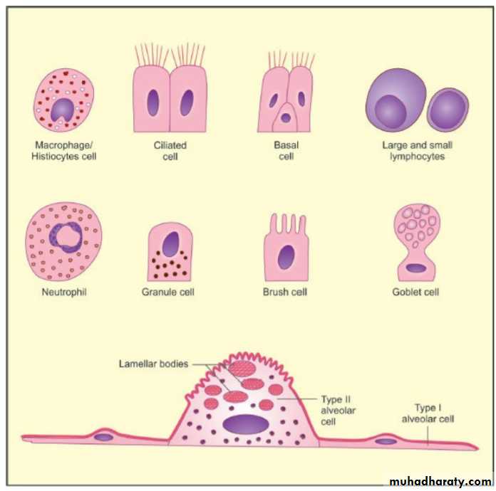 Lymphocytes: Lymphocytes derived from thymus (T lymphocytes) are present. These are concerned with immune mechanism of the respiratory system.