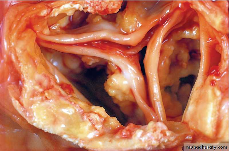 Calcification of the aortic valve. the unopened aortic valve in a heart with calcific aortic stenosis. The semilunar cusps are thickened and fibrotic. Behind each cusp are large, irregular masses of dystrophic calcification that will prevent normal opening of the cusps