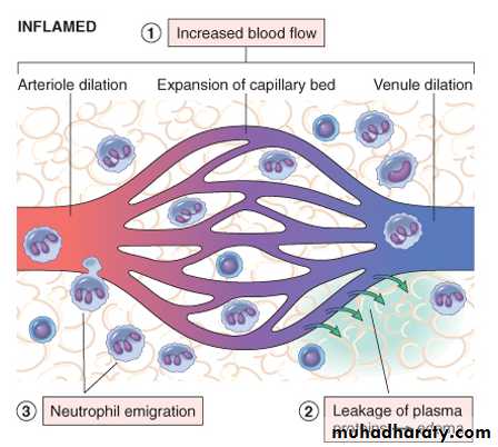 1- Vascular changes: alterations in vessel caliber resulting in increased blood flow (vasodilation) and structural changes that permit plasma proteins to leave the circulation (increased vascular permeability).2- Cellular events: emigration of the leukocytes from the microcirculation and accumulation in the site of injury (cellular recruitment and activation). The principal leukocytes in acute inflammation are neutrophils (polymorphonuclear leukocytes).
