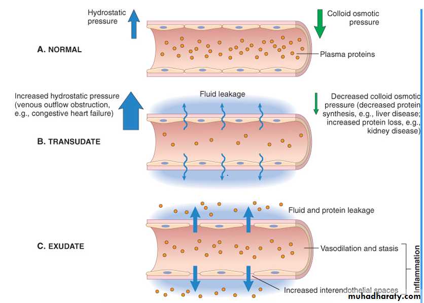 Formation of transudates and exudates A, Normal hydrostatic pressure (blue arrows). B, A transudate is formed when fluid leaks out because of increased hydrostatic pressure or decreased osmotic pressure. C, An exudate is formed in inflammation because vascular permeability increases as a result of increased interendothelial spaces.