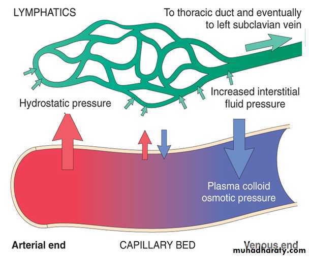 The movement of fluid between vascular and interstitial spaces is controlled mainly by the opposing effects of vascular hydrostatic pressure and plasma colloid osmotic pressure. Normally, the exit of fluid from the arteriolar end of the microcirculation into the interstitium is balanced by inflow at the venular end; the lymphatics drain a small residual amount of excess interstitial fluid . Either increased capillary pressure or diminished colloid osmotic pressure can result in increased interstitial fluid. As extravascular fluid accumulates in either case, the increased tissue hydrostatic and plasma osmotic pressures eventually achieve a new equilibrium, and water re-enters the venules .Excess interstitial edema fluid is removed by lymphatic drainage, ultimately returning to the bloodstream via the thoracic duct ; clearly, lymphatic obstruction (e.g., due to scarring or tumor) can also impair fluid drainage and cause edema.