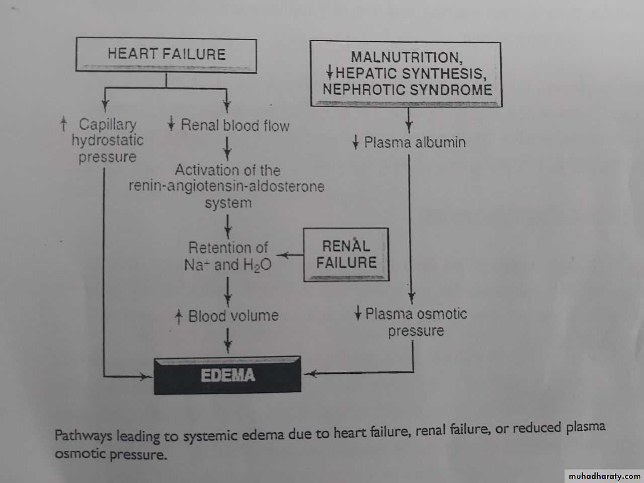 Pathways leading to systemic edema due to primary heart failure, primary renal failure, or reduced plasma osmotic pressure