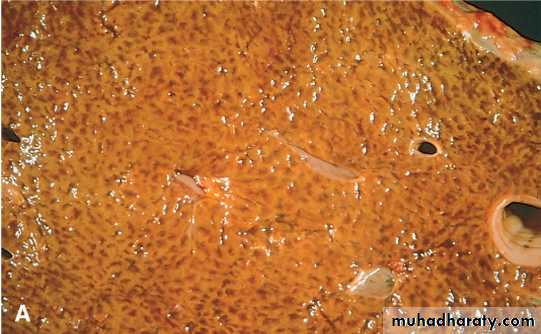 Chronic passive congestion of the liver the central regions of the hepatic lobules are grossly red-brown and slightly depressed (because of a loss of cells) and are accentuated against the surrounding zones of uncongested tan, sometimes fatty, liver ("nutmeg liver ). Microscopically, there is centrilobular necrosis with hepatocyte drop-out, hemorrhage, and hemosiderin-laden macrophages