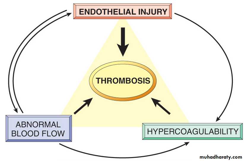 Virchow's triad in thrombosis. Integrity of endothelium is the most important factor. Injury to endothelial cells can also alter local blood flow and affect coagulability. Abnormal blood flow (stasis or turbulence), in turn, can cause endothelial injury. The factors may act independently or may combine to promote thrombus formation.