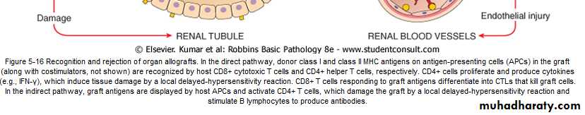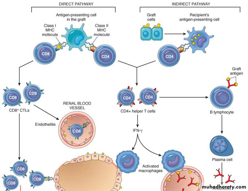 If the transplanted graft bearing foreign MHC antigens ,the recipients immune system attack the donor cells of the transplanted organ .Rejection involves T Cell-Mediated Rejection and Antibody-Mediated Rejection .the initial target of the recipient is graft vasculature .There are three patterns of transplant rejection;-