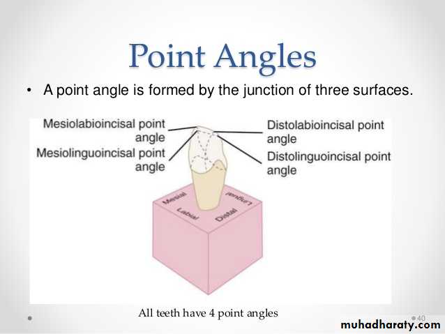 Line Angle: junction of two plane surfaces of different orientation along a line.Point Angle: junction of three plane surfaces of different orientation.