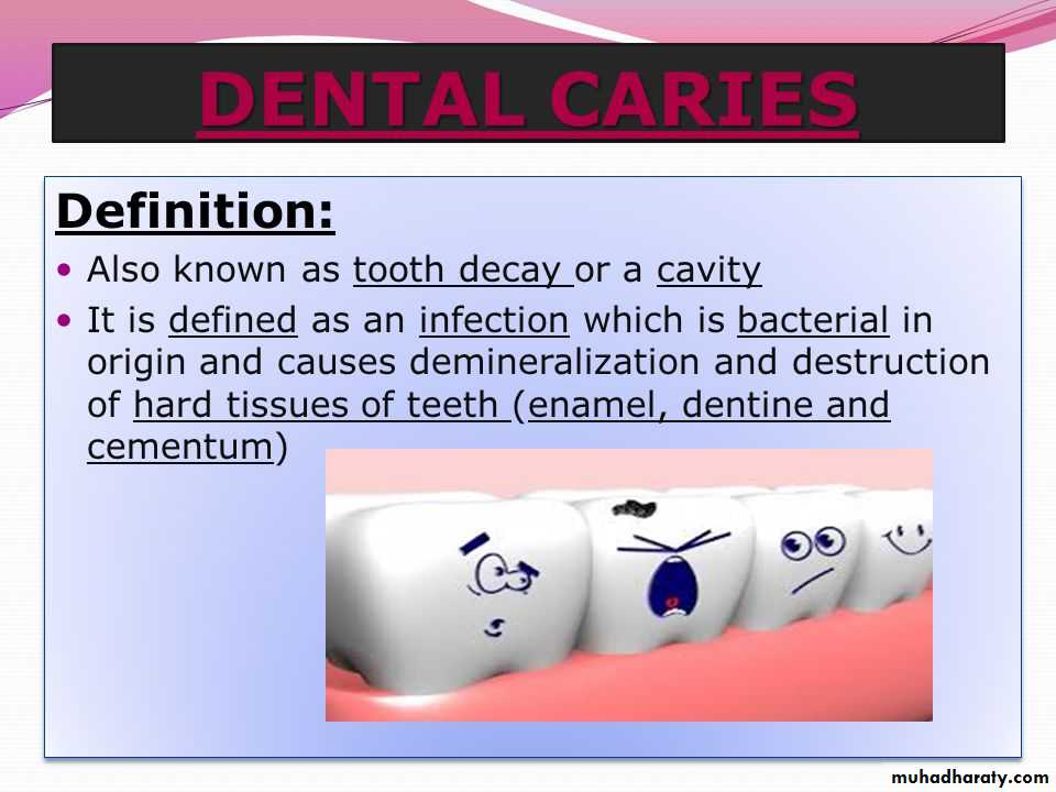 Infectious microbiologic disease that results in localized dissolution and destruction of the calcified tissues of the teeth.Carious lesions originating