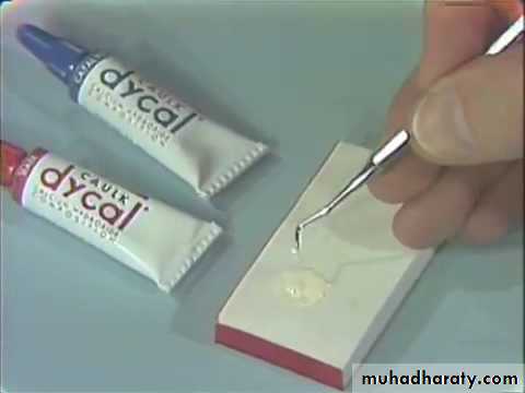 Equal lengths of the different colored pastes are dispensed on a paper pad and then mixed into a uniform color (homogenous) and then applied by using of dycal applicator.The setting time is short about 1-2 minute ,therefore the mix should be done quickly and then applied on a dry dentin so flow freely and easily.