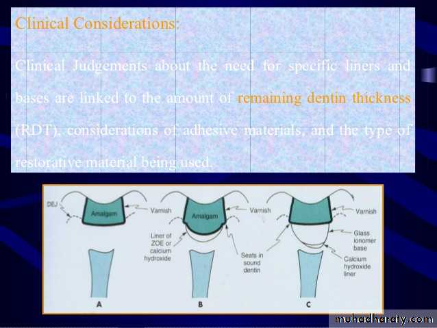 1. The prepared cavity should be clean and dry before application of lining material, the quadrant of the prepared tooth should be isolated completely form saliva, because the entire lining and base material are sensitive to water during their application and setting.2.All liners and base materials undergo dissolution and disintegration in saliva with time; therefore, they should not reach to the margins of the cavity (except varnish and bonding agent).