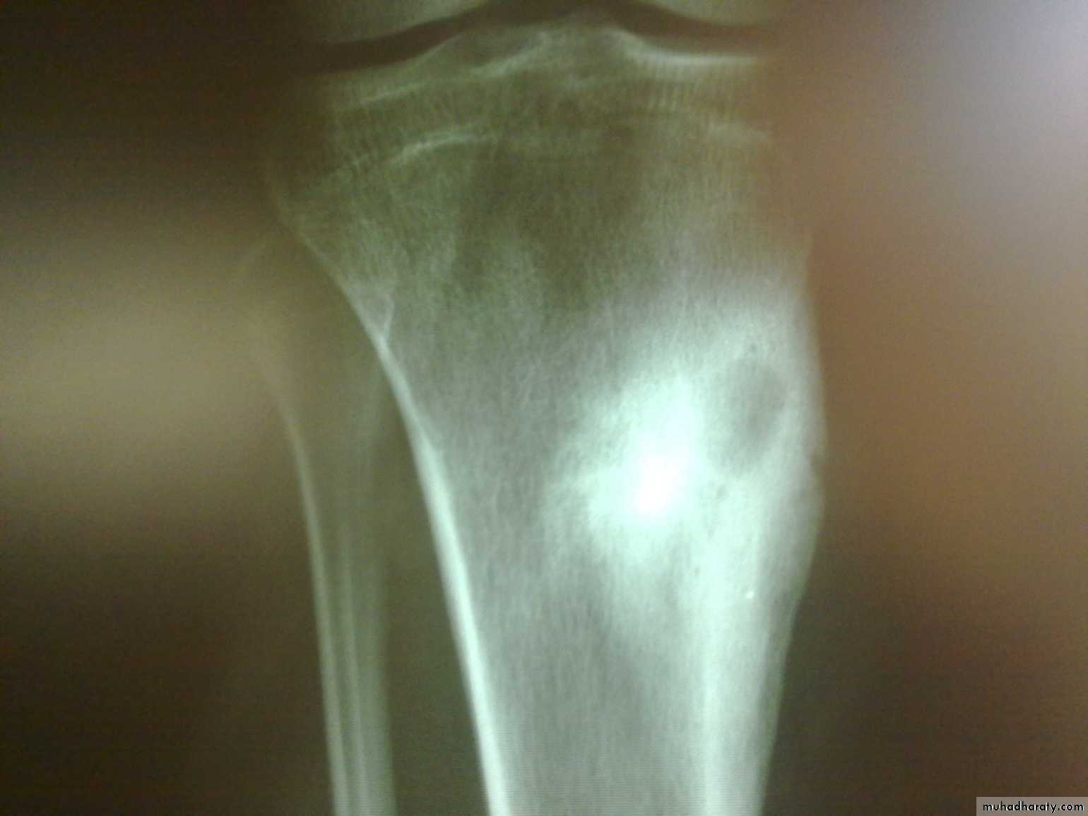 Differential diagnosis is osteoid ostema and malignant bone tumors.Biopsy is needed to confirm the diagnosis.