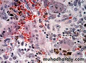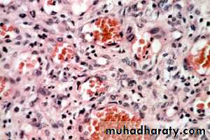 Show highly vascular proliferation that resemble granulation tissue . numerous small and large endothelium lined channels are formed that engorged with RBC. The surface is usually ulcerated ,a mixed inflammatory cell infiltrate of neutrophil, plasma cell and lymphocyte is evident.5-Peripheral giant cell granuloma(PGCG)