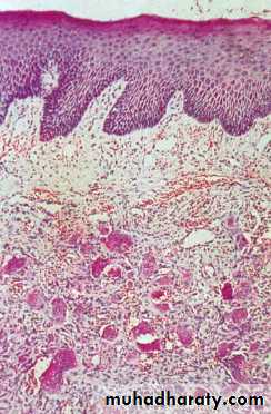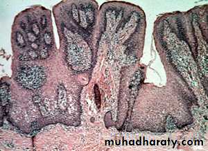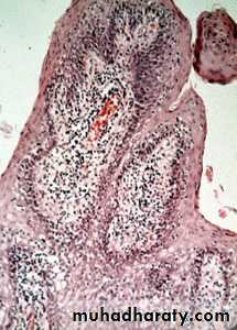 The mucosa show numerous papillary growth on the surface that are covered by hyperplastic stratified squamous epithelium. In advance cases the hyperplastic epithelium show pseudoepitheliomatous hyperplasia in appearance. In the CT Chronic inflammatory cells infiltration is seen.4-Pyogenic granuloma (PG)