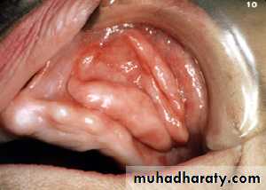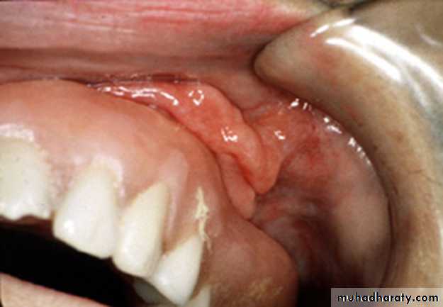 It’s tumor like hyperplasia of CT that develop in association with flange of an ill fitting complete or partial denture also called Epulis fissuratum. Appear as single or multiple fold or folds of hyperplastic tissue in the alveolar vestibule .most often there are two folds of tissue and the flanges of the associated denture fits conveniently in to the fissure between the folds3-Inflammatory papillary hyperplasia of the palate