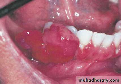 Is a smooth or lobulated mass that is usually pedunculated although some lesions are sessile. The surface is ulcerated and ranges from pink to red to purple.it’s painless but bleeds easily because of it’s extreme vascularity .it’s most frequently occur on the gingiva then the lip, tongue, buccal mucosa.lesion may develop on the gingiva of pregnant woman called pregnancy tumorHistopathological features ofPyogenic granuloma