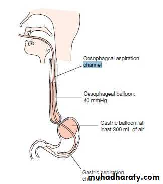 Sengstaken-Blakemore, temporary control; Once inserted, the gastric balloon is inflated with 300 mL of air and retracted to the gastric fundus, where the varices at the oesophagogastric junction are tamponaded by the subsequent inflation of the oesophageal balloon to a pressure of 40 mmHg. The balloons should be temporarily deflated after 12 hours to prevent pressure necrosis of the oesophagus.