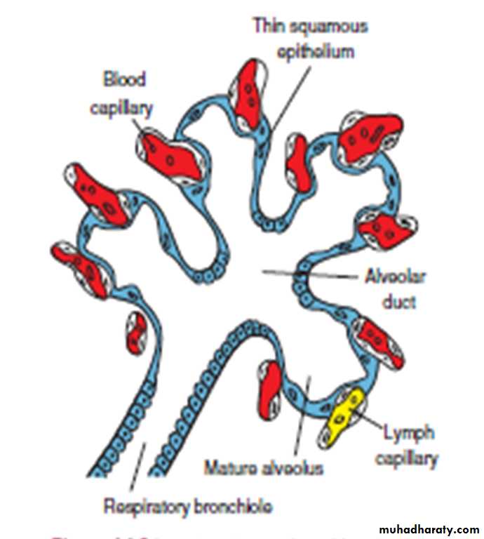 The ducts end in terminal sacs (primitive alveoli) that are surrounded by flat alveolar cells in close contact with neighboring capillaries.