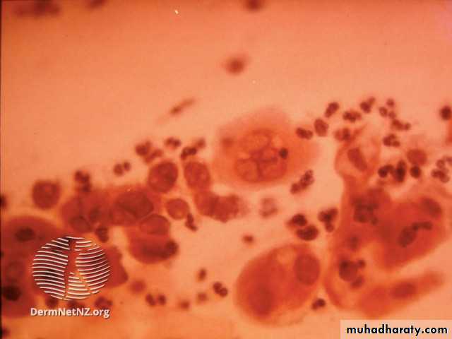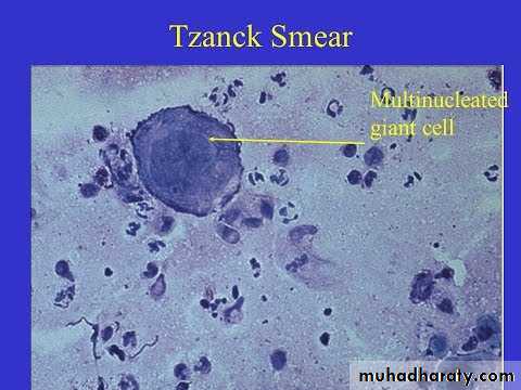 Microscopic examination using oil immersion lens. (Look for multinucleate giant cells)[3]