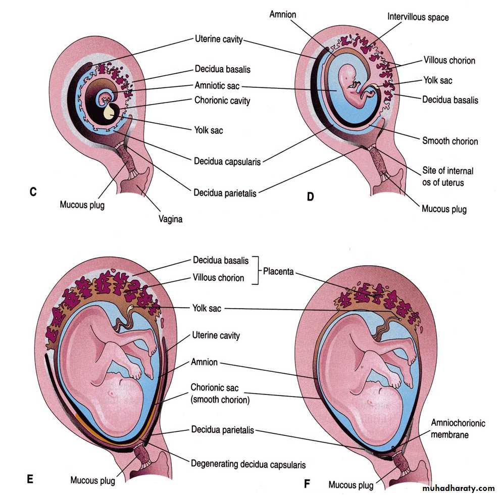 In the early weeks of development villi cover the entire surface of the chorion .As pregnancy advances villi on the emberionic pole continue to grow and expand ,giving rise to the chorion frondosum (bushy chorion ).Villi on the abemberyonic pole degenerate ,and by the third month , this side of the chorion ,now known as the chorion leave , is smooth.