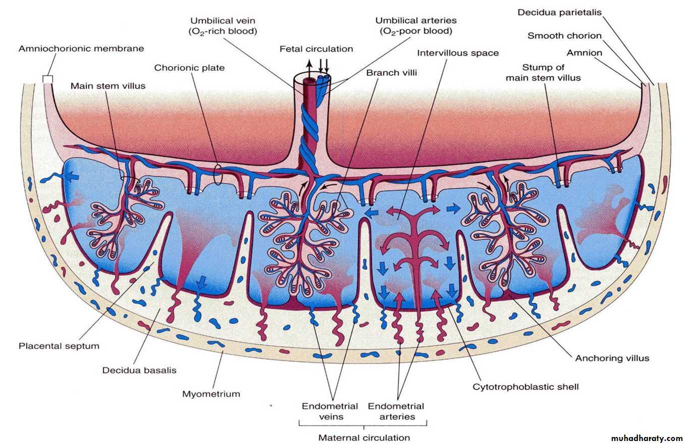 By the beginning of the fourth month, the placenta has two components: (1) a fetal portion, formed by the chorion frondosum and (2) a maternal portion, formed by the decidua basalis.On the fetal side, the placenta is bordered by the chorionic plate on its maternal side, it is bordered by the decidua basalis, of which the decidual plate is most intimately incorporated into the placenta.