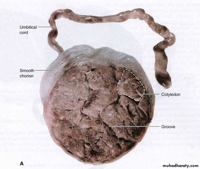 When the placenta is viewed from the maternal side, 15 to 20 slightly bulging areas, the cotyledons, covered by a thin layer of decidua basalis, are clearly recognizable Grooves between the cotyledons are formed by decidual septa.