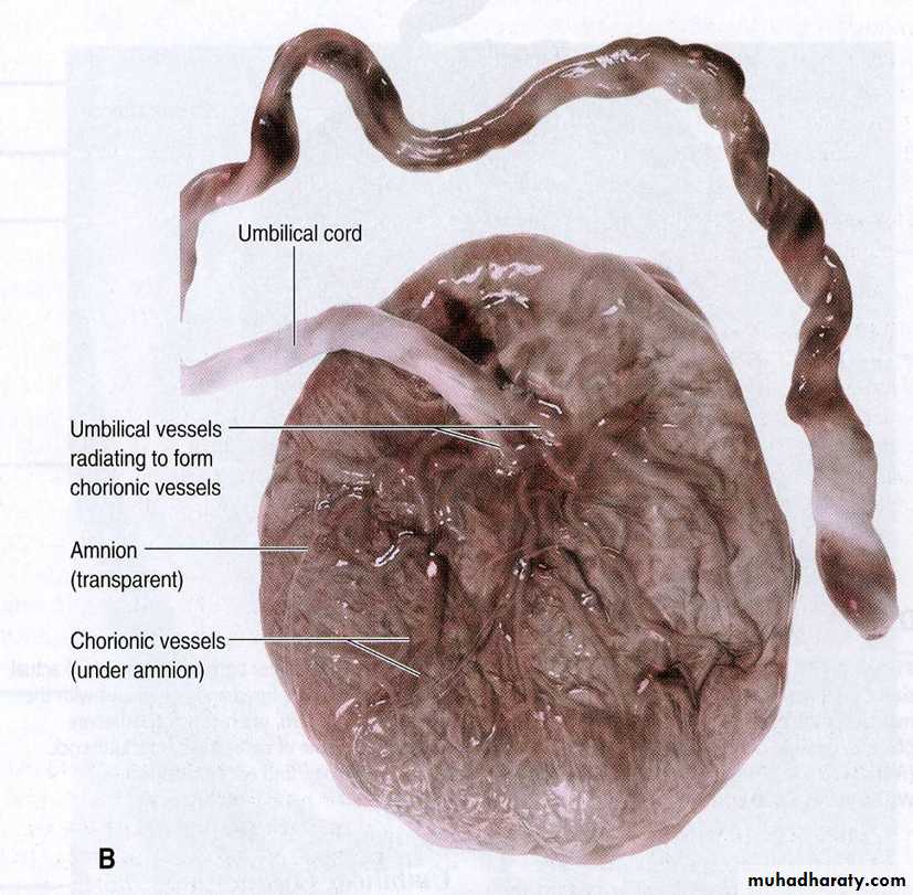 At full term, the placenta is discoid with a diameter of 15 to 25 cm, is approximately 3 cm thick, and weighs about 500 to 600 g.At birth, it is torn from the uterine wall and,approximately 30 minutes after birth of the child, is expelled from the uterine cavity as the afterbirth.