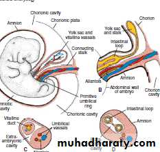 At the fifth week of development ,the following structures pass through the ring(1)the connecting stalk, containing the allantois and the umbilical vessels, consisting of two arteries and one vein;