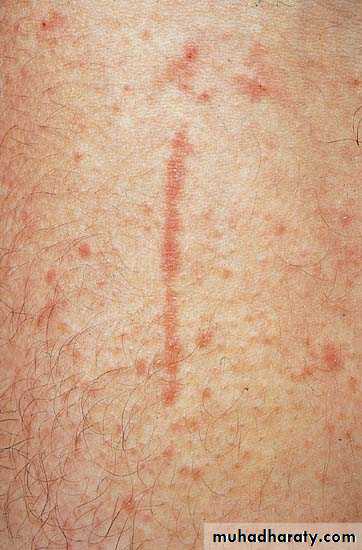 • Well-demarcated, sharply defined• erythematous (salmon pink)